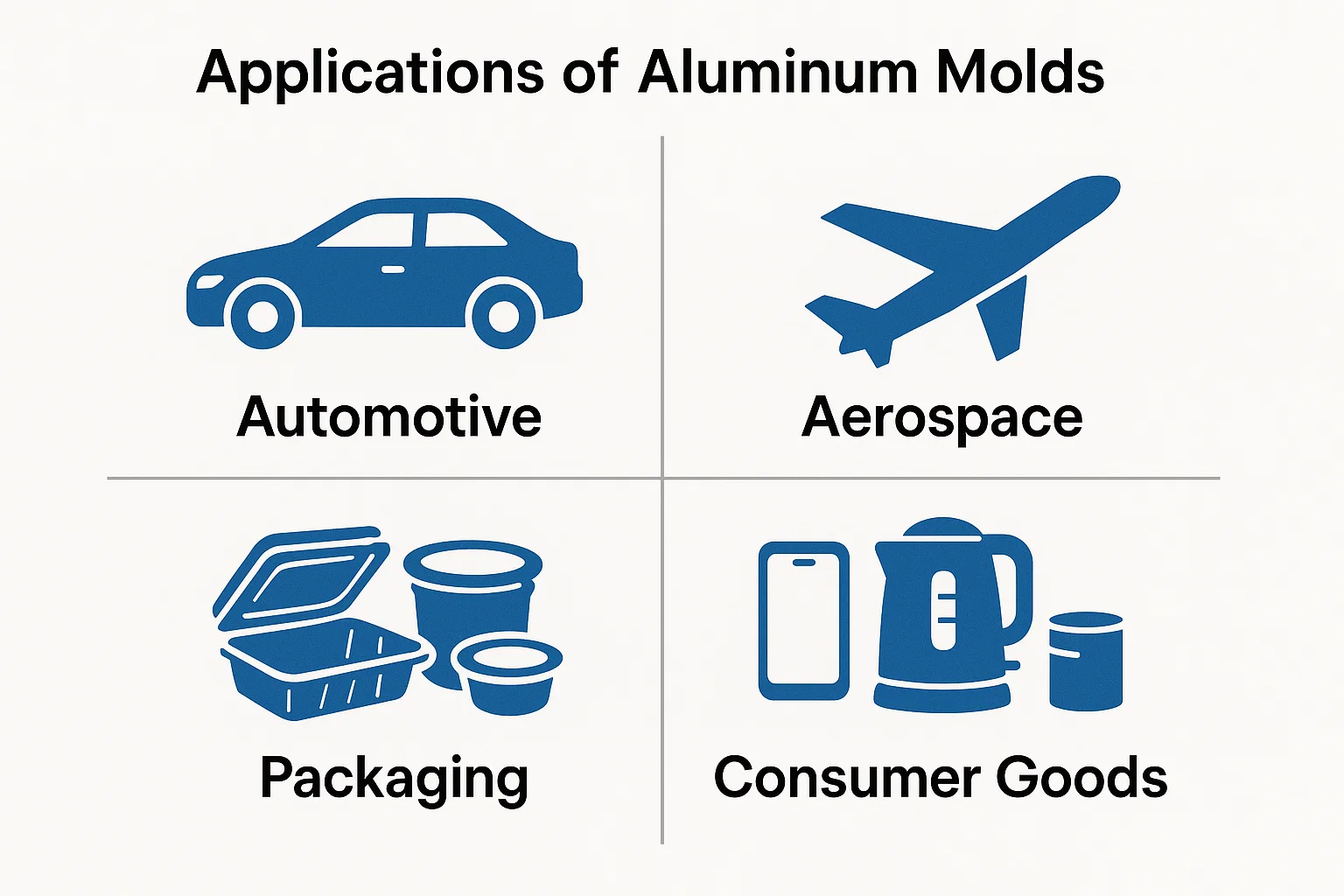 Havacılık Hassasiyet ve ağırlığın en önemli olduğu havacılık sektöründe, alüminyum kalıplar hem uçak iç mekanları hem de dış mekanlar için yapısal olmayan parçalar ve bileşenler oluşturmak için kullanılır. Hafif doğaları, kalıplama işlemi sırasında kullanımı basitleştirir ve maliyet etkinlikleri onları daha küçük miktarlarda özel parçaların üretimi için ideal hale getirir.