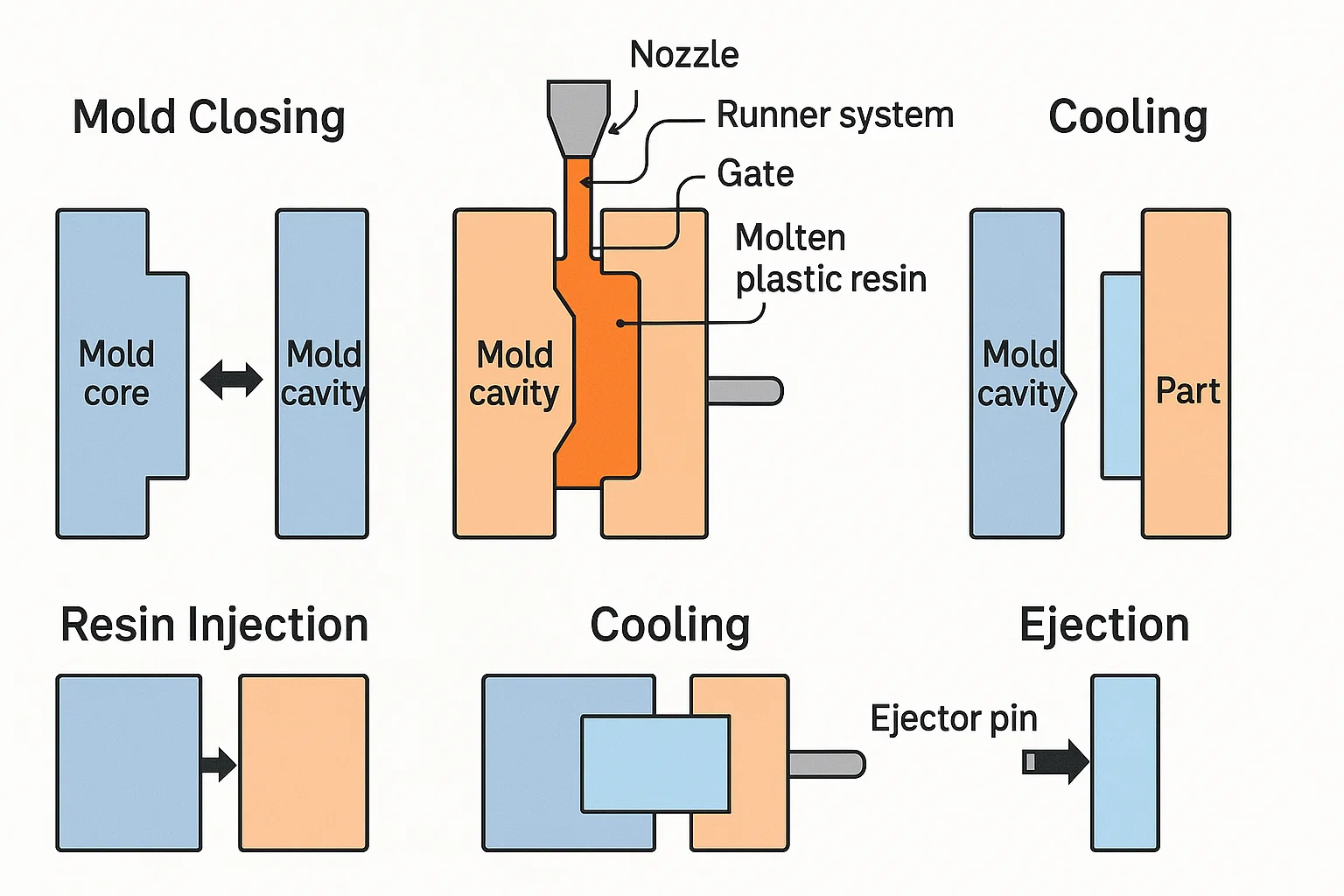 Reçine enjeksiyonu: Erimiş plastik reçine, bir nozuldan ve kalıp içine yüksek basınç altında enjekte edilir. Malzeme içinden geçer koşucu sistemi and geçit - Boşluk yarısının bir parçasıdır ve çekirdek ve boşluk arasındaki boşluğu doldurur. Çekirdek, parçanın iç şeklini oluşturmak için reçineyi değiştirirken, boşluk dış kabuğu oluşturur.