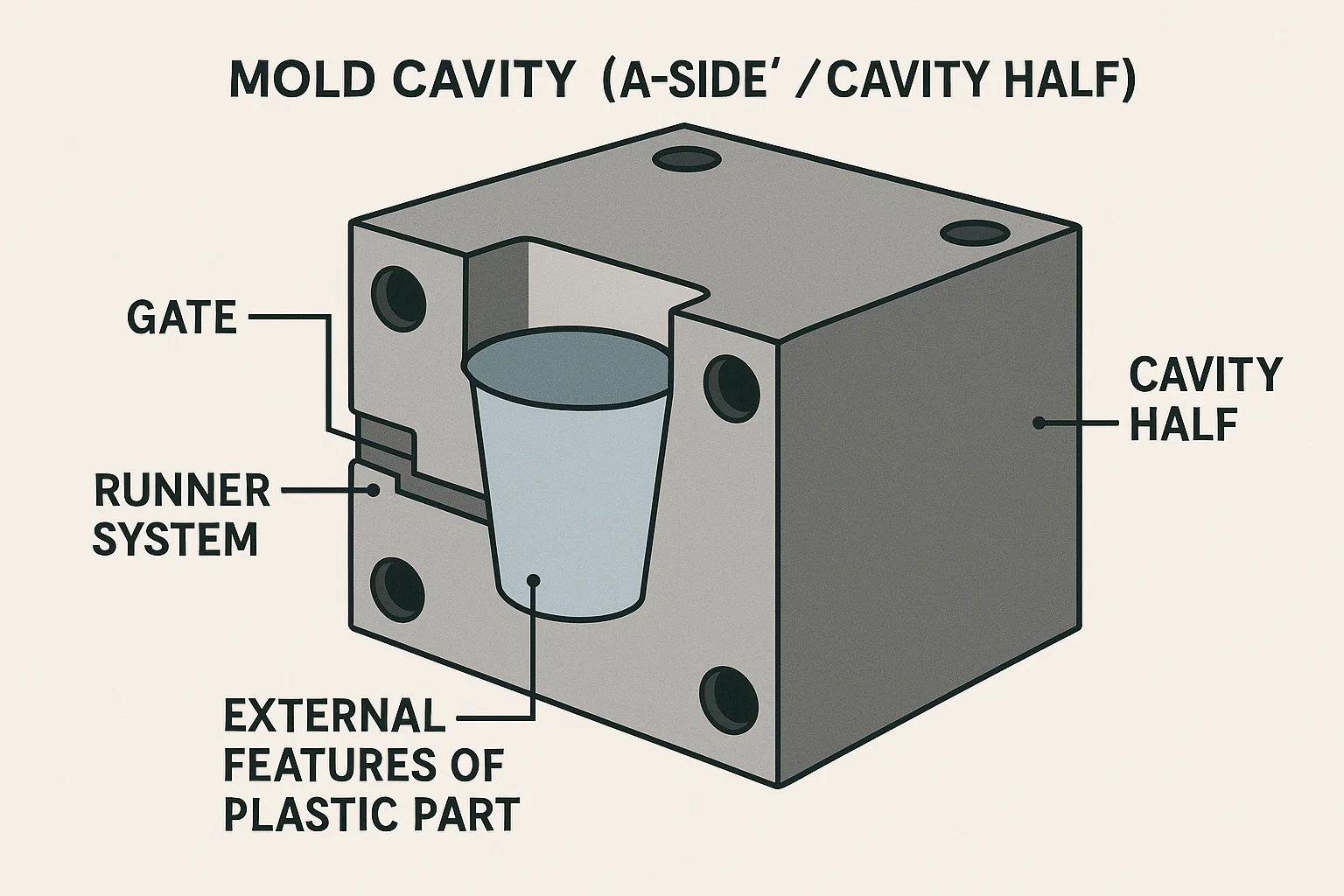 . kalıp boşluğu , "A tarafı" veya "boşluk yarısı" olarak da bilinir, harici özellikler plastik parçanın. Erimiş plastiğin doldurduğu dış kabuk veya kaptır. Plastik bardak benzetmesini kullanarak, boşluk dudağı ve dış duvarları da dahil olmak üzere fincanın dışını oluşturacaktır.
