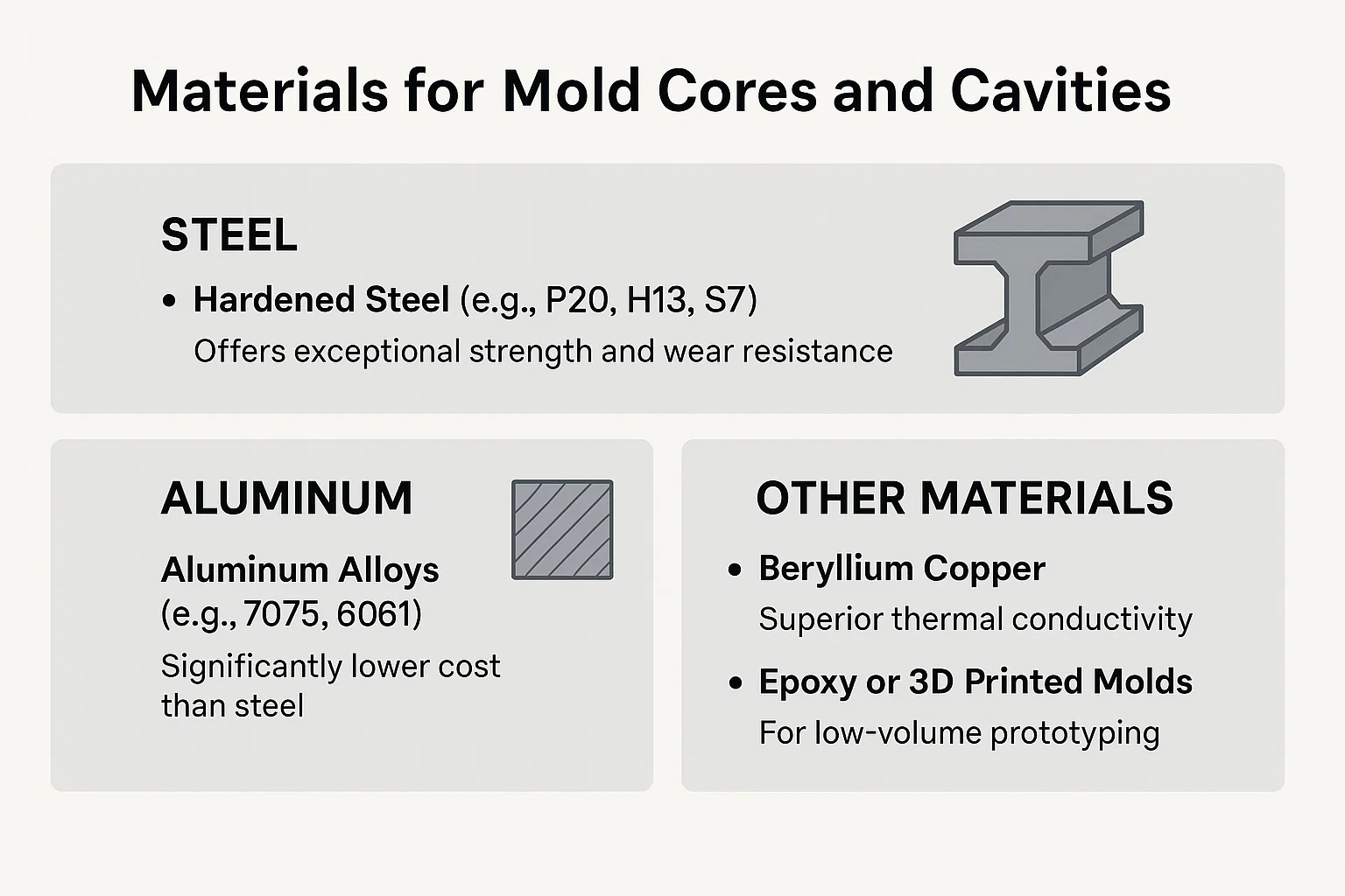Genellikle, kalıp çekirdekleri sertleştirilmiş çelik, alet çeliği veya daha düşük üretim hacimleri için alüminyum gibi dayanıklı ve ısıya dayanıklı malzemelerden yapılır. Malzeme seçimi, kalıplanmış plastik, parçanın karmaşıklığı ve gerekli üretim hacmine bağlıdır.