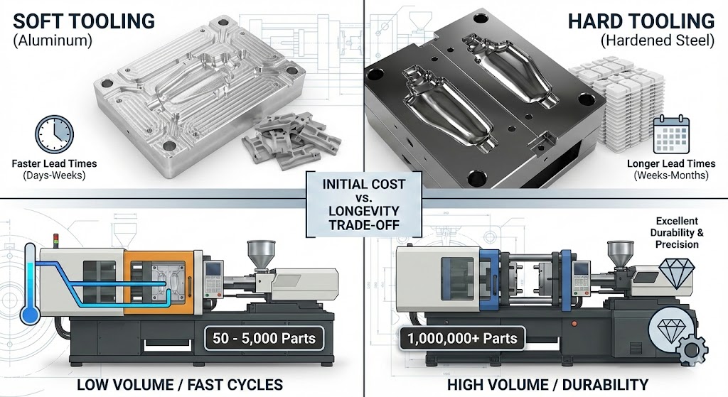 Kritik lansman tarihine yetişmek için parçalara 3 hafta içinde mi ihtiyacınız var, yoksa 3 ayınız mı var? Hız çok önemliyse, hızlı teslimat yapabilen tek seçenek yumuşak takımdır. Sert takımlama yavaş ve kasıtlı bir süreçtir.