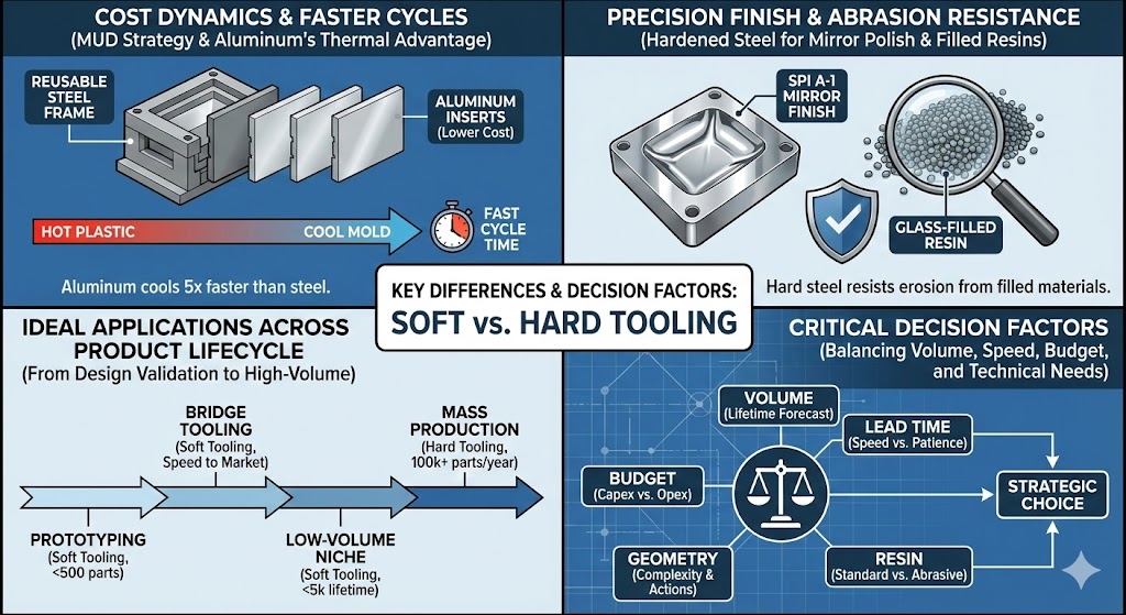 - Yumuşak Takımlama Advantage: Alüminyum, çelikten önemli ölçüde daha yüksek ısı iletkenliğine sahiptir. Isıyı plastikten çok daha hızlı çekerek parçanın daha hızlı katılaşmasını sağlar. 5.000 parçalık bir üretim çalışması için, bir alüminyum aletin daha hızlı çevrim süresi, bazen çok ucuz bir çelik alete kıyasla daha yüksek olan başlangıç maliyetini dengeleyebilir.
