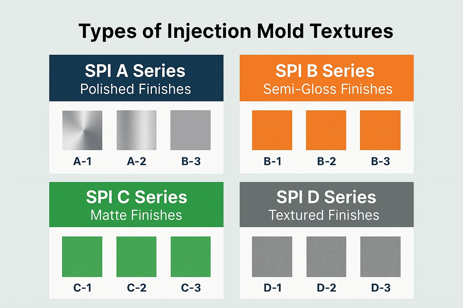 Enjeksiyon kalıbı dokuları dünyası çok büyüktür, ancak Plastik Endüstrisi Derneği (SPI) tarafından geliştirilen bir sistem tarafından büyük ölçüde standartlaştırılmıştır. Bu standartları anlamak, bir parça için gereken tam bitişi belirlemek için çok önemlidir.