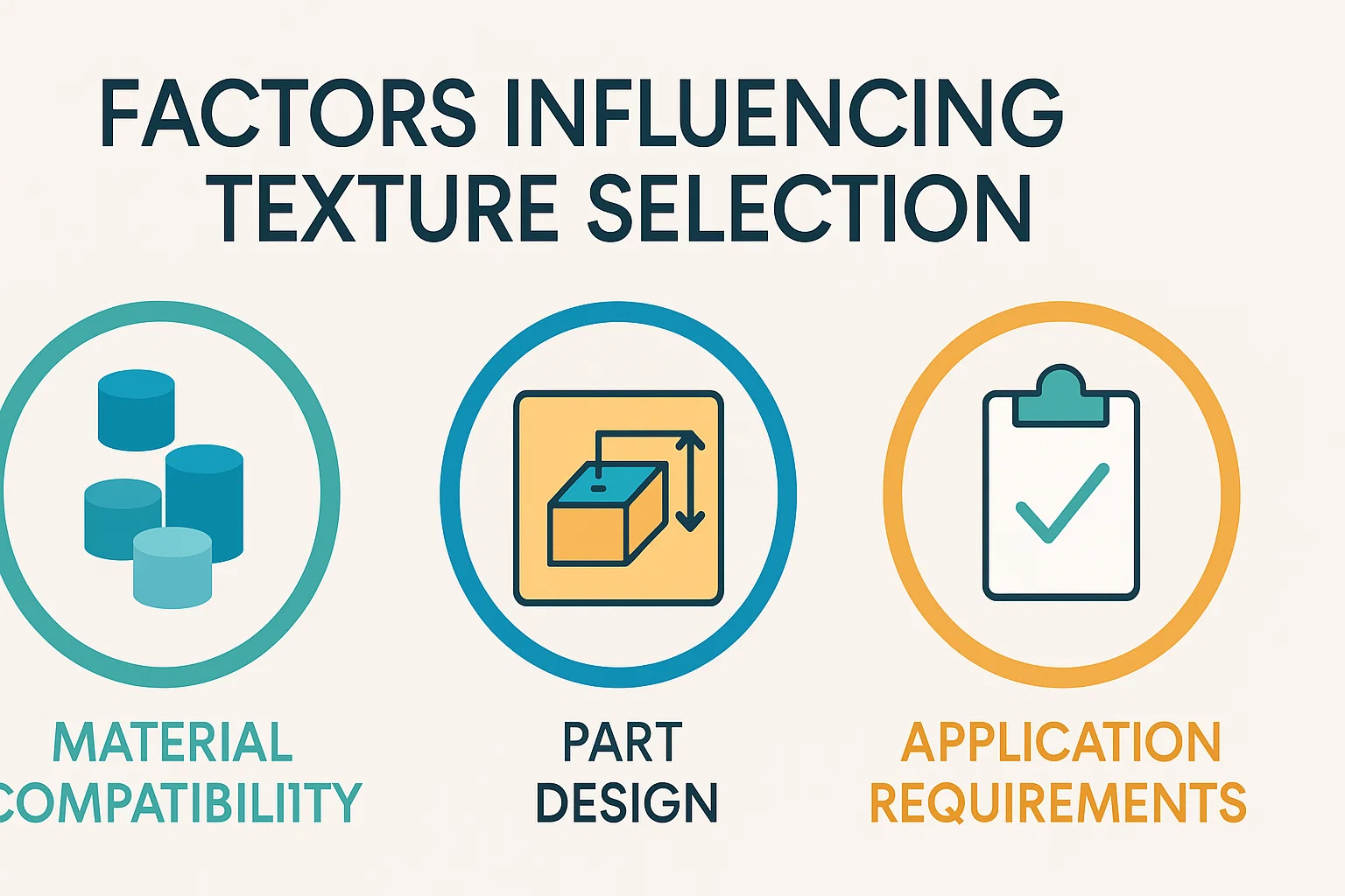 Bir parça için doğru kalıp dokusunu seçmek, estetiği, işlevselliği ve üretim kısıtlamalarını dengeleyen kritik bir karardır. Seçim süreci nadiren tek bedene uyan bir yaklaşımdır ve büyük ölçüde üç temel faktöre bağlıdır: parçanın malzemesi, tasarımı ve nihai uygulama gereksinimleri.