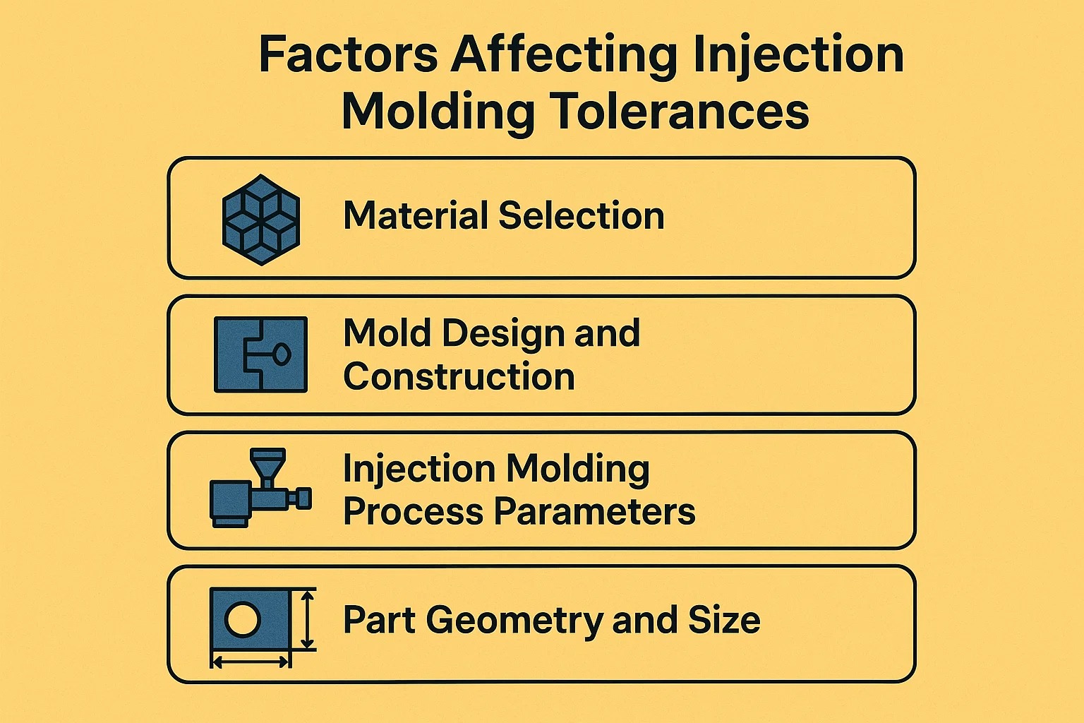 - Malzeme Potansiyeli Belirler: Polipropilen (yüksek büzülme) üzerinde, Polikarbonat (düşük büzülme) ile aynı toleransı koruyamazsınız.