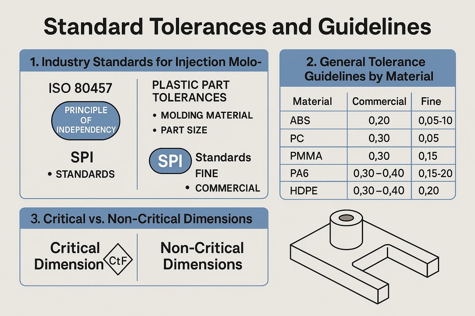 Bu kılavuz, ISO 20457 gibi endüstri stveartlarından deneyimli kalıpçılar tarafından kullanılan pratik "çelik güvenli" tasarım stratejilerine kadar enjeksiyon kalıplama toleranslarının karmaşıklığı konusunda boyut yol gösterecektir.