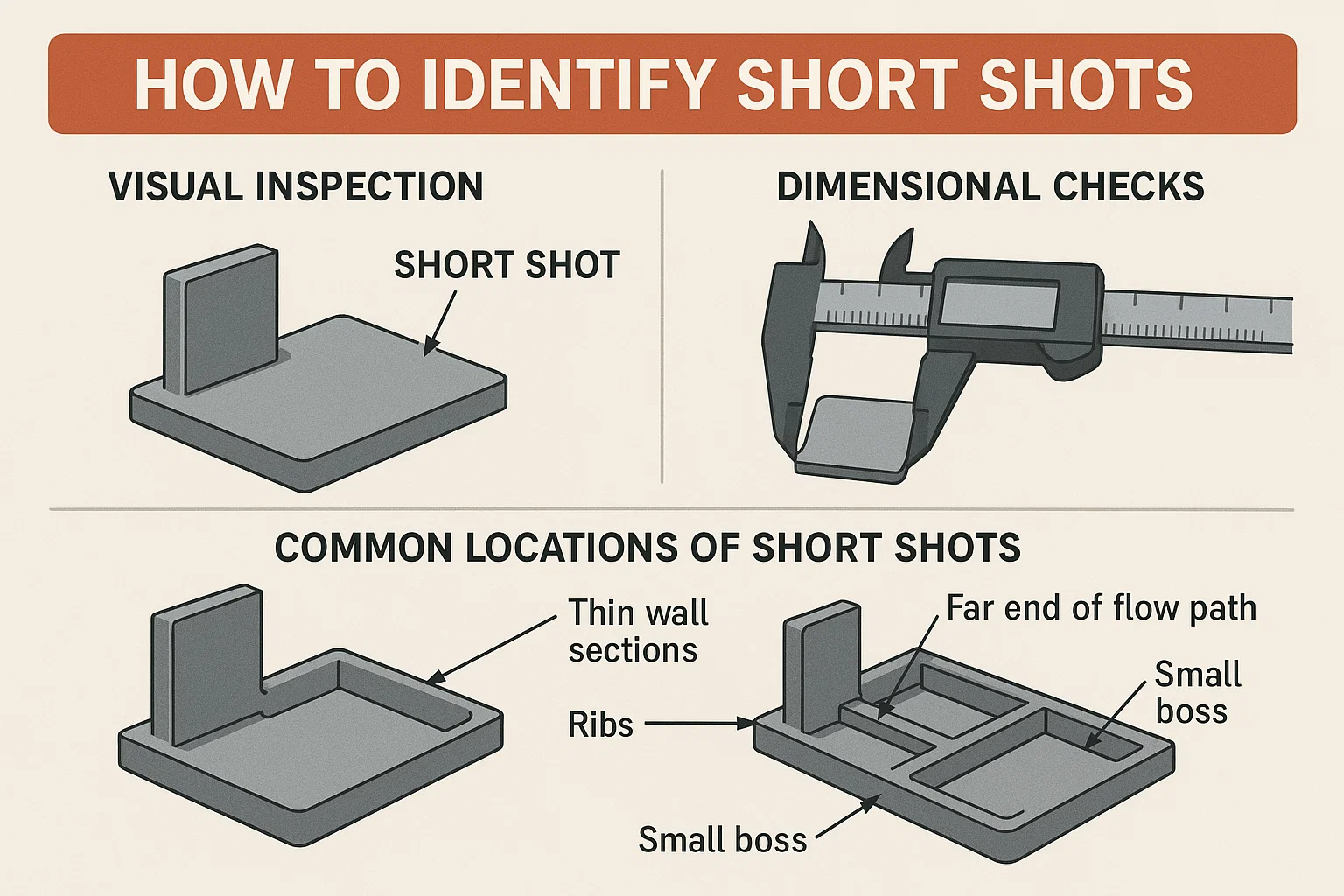 Kısa çekimler neredeyse her zaman akış yolunun sonu , plastiğin boşluğa girdiği kapıdan en uzak nokta. Erimiş plastik, hareket ederken ısı ve basıncı kaybeder, bu nedenle doldurulacak son alanlar kısa bir atışa en duyarlıdır. Bu alanlar genellikle: