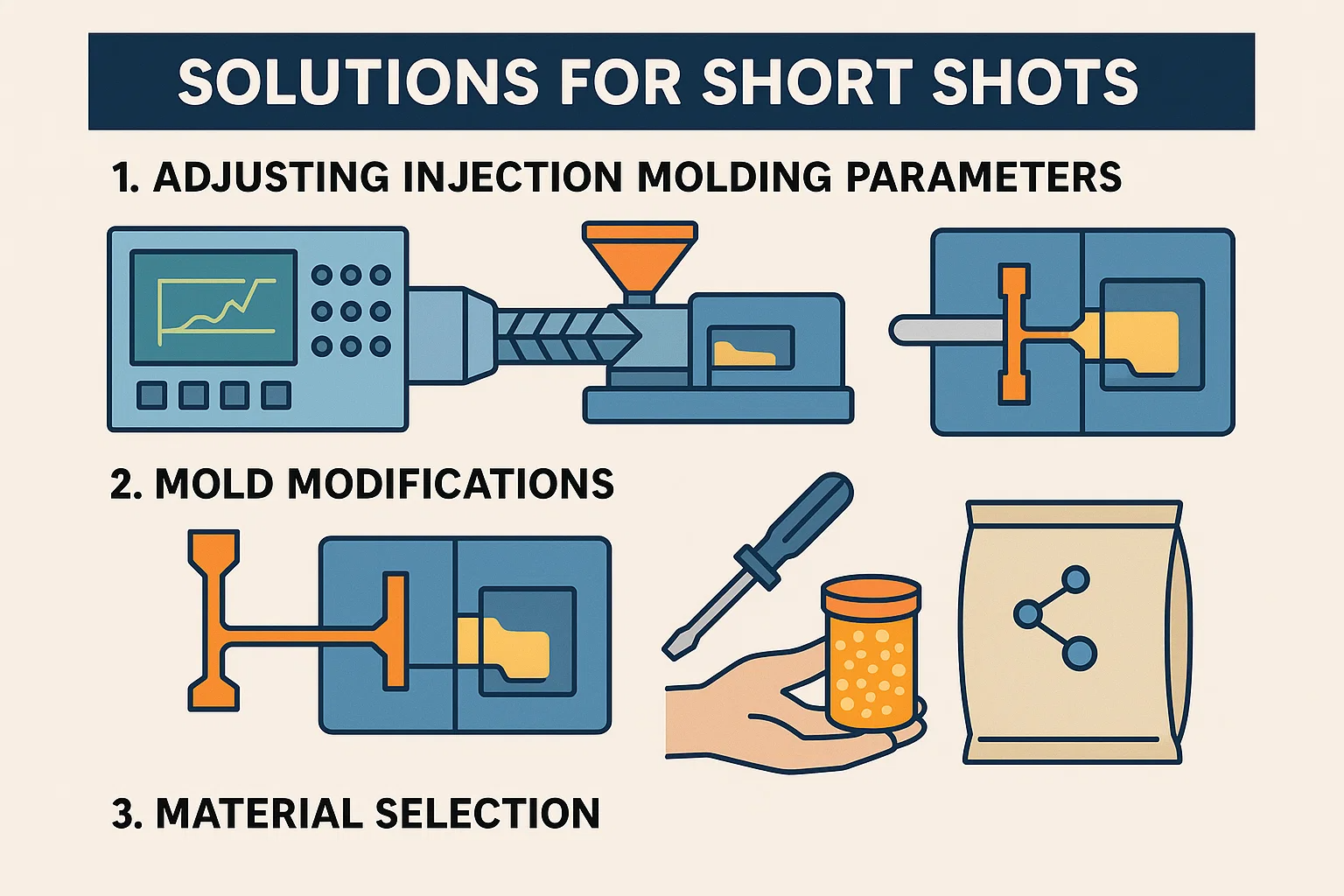Kısa bir çekimi çözmek stratejik bir yaklaşım gerektirir. Daha karmaşık ve pahalı olanlara geçmeden önce en kolay ve en uygun maliyetli çözümlerle başlamak genellikle en iyisidir. Makine ayarlarıyla başlayın, ardından malzemeyi düşünün ve son olarak kalıbın kendisine bakın.