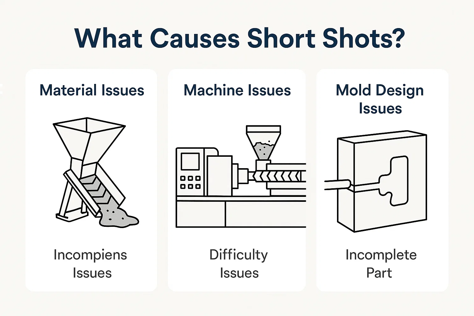 Kısa bir çekim teşhisi sistematik bir yaklaşım gerektirir, çünkü neden enjeksiyon kalıplama işleminin birkaç farklı alanından kaynaklanabilir. En yaygın sorunlar malzemeye, makine ayarlarına veya kalıp tasarımının kendisine kadar izlenebilir.